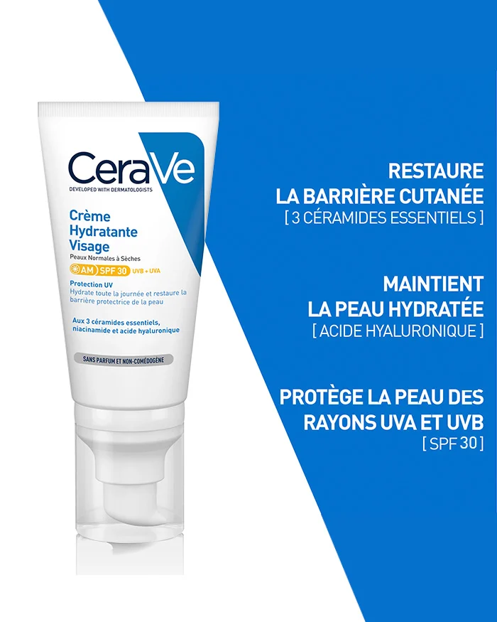 La crème hydratante visage SPF 30 proposée par la marque CeraVe est un soin de jour parfait pour les personnes ayant la peau normale à sèche. Comme son nom l’indique, elle allie une action hydratante et une haute protection solaire.