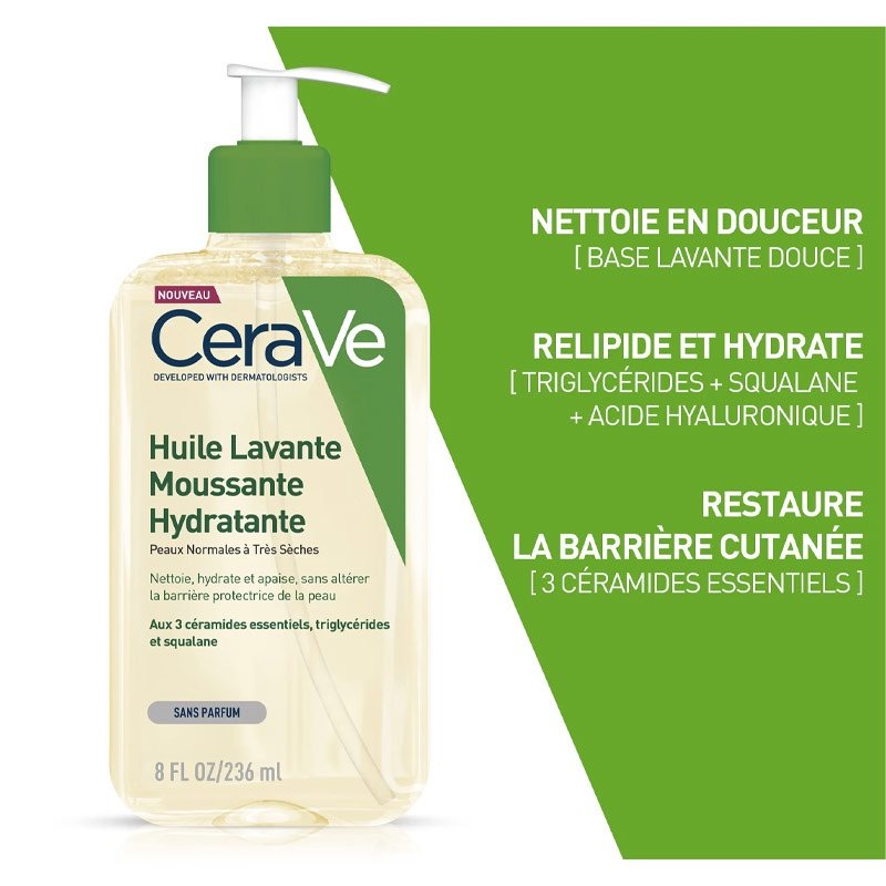 L’Huile Lavante Moussante Hydratante de CeraVe, est un soin nettoyant formulé pour répondre aux besoins des peaux normales à très sèches et des peaux à tendance atopique. Sa formule enrichie aux 3 céramides essentiels et à l’acide hyaluronique nettoie en douceur, relipide et nourrit la peau sous la douche. Le principal rôle de cette huile hydratante Cerave est de nettoyer la peau sans l’altérer. Elle s’appuie, pour ce faire, sur une base lavante enrichie d’acides aminés qui mousse afin d’évacuer les impuretés tout en relipidant la couche supérieure. Elle est bien aidée, qui plus est, par le triglycéride qui agit en renforçant le film hydrolipidique naturel qui recouvre la peau et la protège à la fois des irritations et du dessèchement trop rapide du derme. Les 3 céramides essentiels s’ajoutent à ceux présents dans la membrane des cellules et contribuent, en associant avec le squalène, à la prolifération de celles-ci. La peau se régénère plus rapidement et retrouve toute sa souplesse, ainsi que sa résistance.