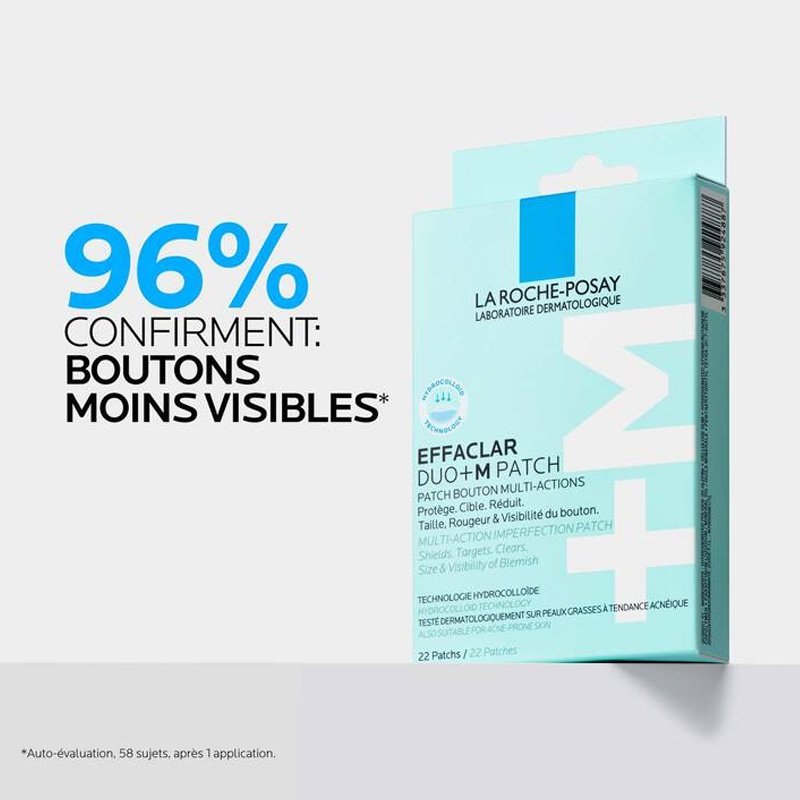 Les patchs Effaclar Duo + M sont la solution idéale pour les peaux à imperfections et les boutons. Le patch Effaclar Duo+M de La Roche-Posay est un soin localisé multi-actions, conçu pour cibler, protéger et réduire les imperfections visibles dès 3 heures. Grâce à la technologie hydrocolloïde, chaque patch ultra-fin forme une barrière protectrice qui préserve l’hydratation, absorbe les impuretés et aide à accélérer la disparition des boutons, tout en réduisant les marques post-acné. Avec une épaisseur de 420 microns, les patchs s’adaptent parfaitement à la peau pour un port confortable, de jour comme de nuit, sans se décoller. Ces patchs ultra-fins et invisibles, se fondent naturellement dans la peau pour une action discrète mais efficace.